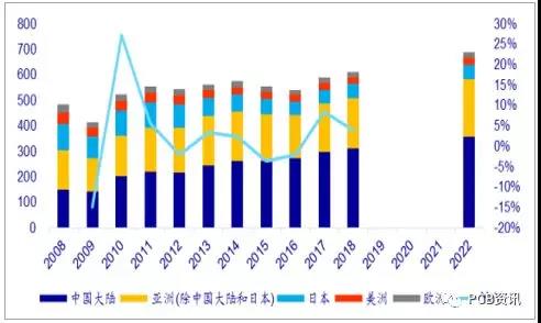 2015-2016 年全球宏觀經(jīng)濟(jì)不景氣,下游需求疲乏, PCB 產(chǎn)值首次呈負(fù)增長(zhǎng)。 2017 年 PCB 市場(chǎng)回暖,同比增長(zhǎng) 8.6%,是 2011 年以來(lái)增長(zhǎng)率最高的一年。各終端產(chǎn)品中, 除計(jì)算機(jī)萎縮外,其它產(chǎn)品維持平穩(wěn)水平,帶動(dòng) PCB需求增長(zhǎng)。另外,消費(fèi)市場(chǎng)的各類新興電子產(chǎn)品應(yīng)用,如穿戴電子裝置、電子助聽(tīng)器、血糖儀、電動(dòng)汽車智能化裝置、 航空航天等領(lǐng)域,亦帶動(dòng) PCB 訂單增加。根據(jù)市場(chǎng)分析機(jī)構(gòu)在全球電子信息產(chǎn)業(yè)持續(xù)發(fā)展的帶動(dòng)下, 2017-2022 年,全球 PCB 產(chǎn)值復(fù)合增長(zhǎng)率為 3.2%,其中中國(guó)大陸 PCB 產(chǎn)值將從 2017 年的 297 億美元增至 357 億美元, CAGR3.7%。