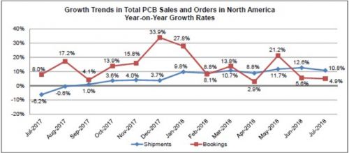 2018年7月份,PCB訂單量,與去年同期相比,增加了4.9%;年初至今的訂單量高于去年11.7%;與上個月相比,7月份的訂單量減少了12.3%。