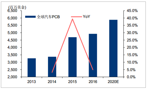 2016 年全球汽車產(chǎn)量達(dá) 9497.66 萬(wàn)輛,同比增長(zhǎng) 4.5%,其中中國(guó)市場(chǎng)汽車產(chǎn)量為 2811.88 萬(wàn)輛,同比增長(zhǎng) 14.5%。如果以當(dāng)前存量市場(chǎng)考慮,單車PCB 平均價(jià)值由 2016 年的 55 美金提升至 2020 年的 65 美金,則全球車用 PCB 新增需求約 9.5 億美金,相當(dāng)于 2016 年車用 PCB 市場(chǎng)的 19.2%,2016-2020 年行業(yè) CAGR 約為 4.51%。