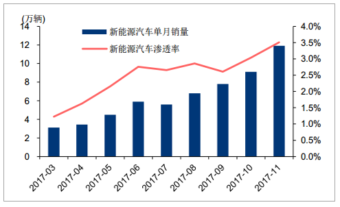 17 年 11 月新能源車在國(guó)內(nèi)汽車市場(chǎng)的滲透率已經(jīng)超過(guò) 3.5%